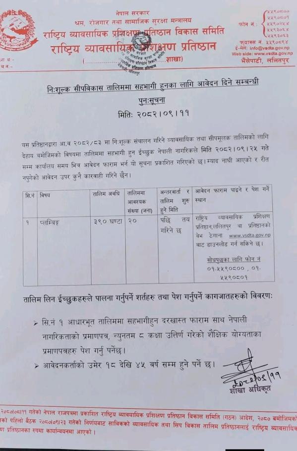 निःशुल्क सिपविकास तालिममा सहभागि हुनका लागि आवेदन दिने सम्बन्धी पुनः सूचना।