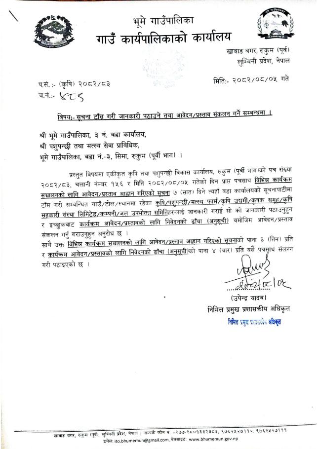 Home » एकीकृत कृषि तथा पशुपन्छी विकास कार्यालय, रुकुमकोट, रुकुम (पूर्वी भाग) कार्यालयको विभिन्न कार्यक्रम सञ्चालनको लागि आवेदन/प्रस्ताव आह्वान गरिएको सूचना ।